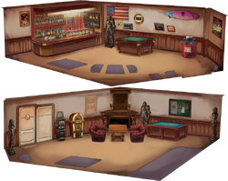 The Rec Room is equanimous of a unmarried, well-furnished room containing a well-stocked bar complementing all manners of entertainment and amusement to preclude the setting in of boredom during the long hours. On the forepart wall nigh the entrance, at that place is an antiquarian fireplace with candles and a bottle of oil sitting on top of its mantle. To the right of the fireplace is a mysterious knight statue. In front of the fireplace is a simple tabular array with a jar of jam, a chessboard, and a chess rulebook on top of it. Complimenting the table are 2 brown sofas. To the left of the fireplace, there a yellow jukebox and slot machine, both seemingly operational given the correct ability source.